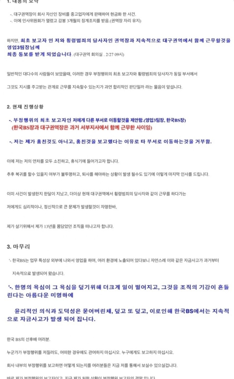 글쓴이는 특히 ‘(시간이 경과하자) 부정행위의 최초 보고자인 저에게 다른 부서로 이동할 것을 영업 3팀장과 한국 BS장이 함께 제안했지만, 자신이 훔친 것도 아니고 훔친 것을 보고했기에 타 부서로 이동하는 것을 부당하다며 거부했다’라고 밝혔다.