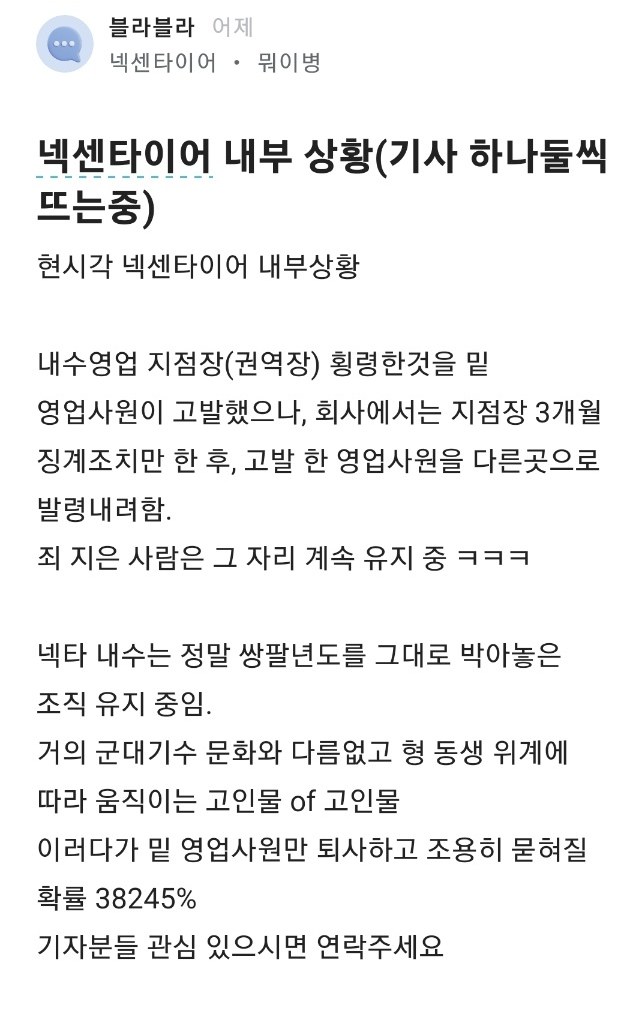 최근 한 직장인 익명 커뮤니티에서는 ‘넥센타이어 국내 조직 상황’이라는 제목의 게시글이 올라왔다. 내용에는 A씨로 추정되는 글쓴이가 ‘대구 권역장이 횡령을 한 것을 회사 측에 보고했으나, 영업3팀장이 해당 권역장과 지속적으로 대구권역에서 함께 근무할 것을 통보했다’는 글을 게재했다.