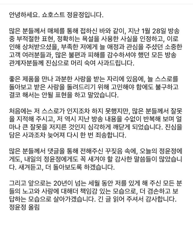 #정윤정 #쇼핑호스트 #쇼핑호스트욕설 #홈쇼핑 #홈쇼핑사고 #R8 #사과문 #사과글