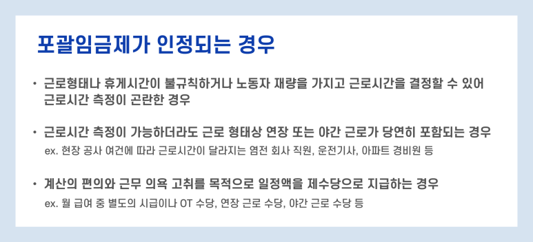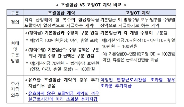 노동부는 포괄임금제를 크게 ‘포괄임금 계약’과 ‘고정OT(연장근로) 계약’으로 나누고 있다. 포괄임금 계약은 각각 산정해야 할 복수의 임금항목을 포괄해 일정액으로 지급하는 것이다. 기본임금과 수당을 구분하지 않거나 기본임금과 수당 총액은 구분하되 개별 수당 간 금액은 구분하지 않는 유형이 있다. 노동부는 유효한 포괄임금 계약의 경우 사용자에게 추가 임금지급 의무가 없고, 유효하지 않은 포괄임금 계약의 경우엔 실제 노동시간에 따라 추가지급 의무가 있다고 본다.