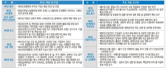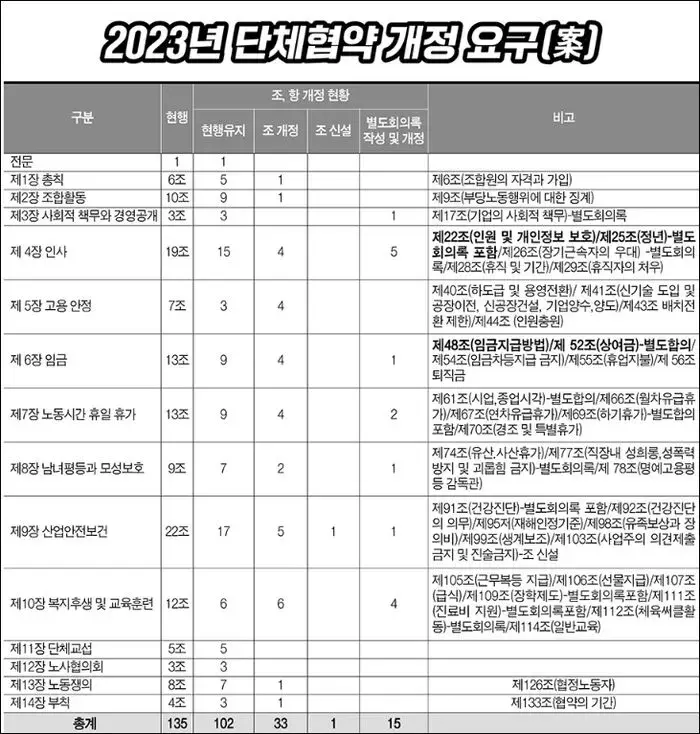 단체협약 개정도 요구했는데 조 개정이 총 33건, 조 신설이 1건, 별도회의록 작성 및 개정이 15건이다.