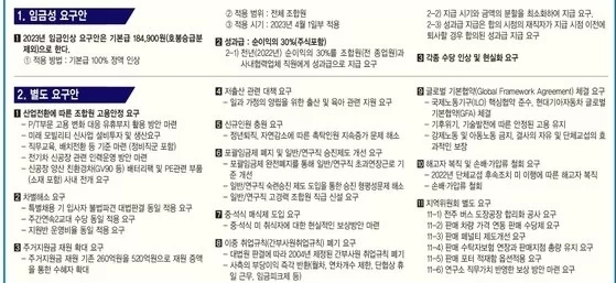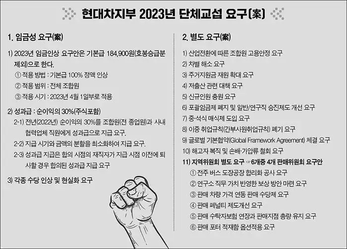현대차 노조가 요구안에 담은 2023년 단체교섭 요구는 임금성 요구 3가지, 별도 요구 10가지, 지역위원회의 별도 요구 6가지가 포함됐다.