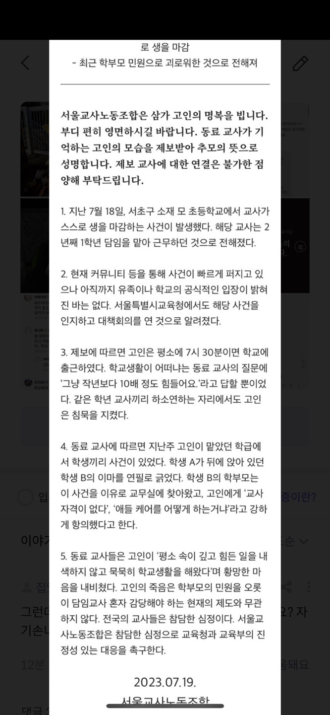 서초에서 한 초등학교 교사가 ㅈㅅ하는 일이 발생했다
