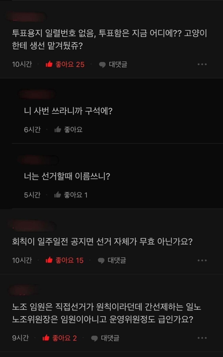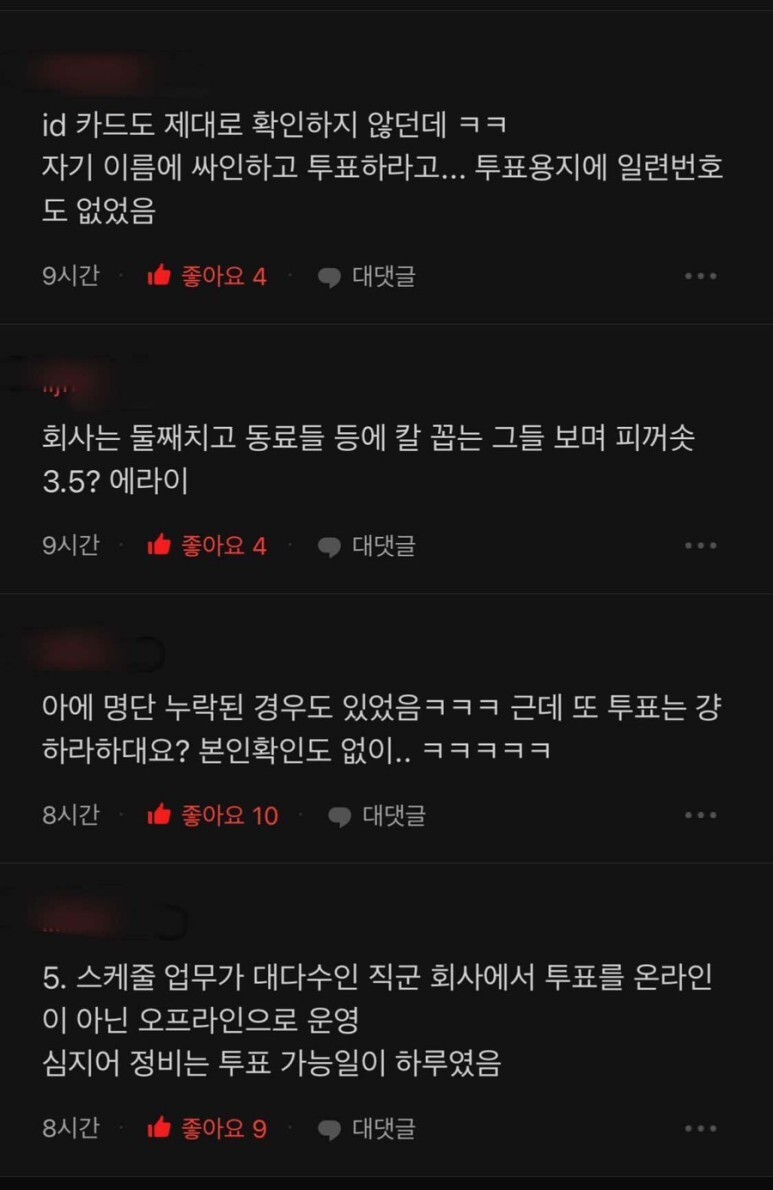 : 실시간으로 올라온 사내게시판이나 블라인드게시판의 후기에 의하면, 본인 아이디 체크 없이 노조에서 지참한 명단에 체크만 하고 투표를 하게 함.