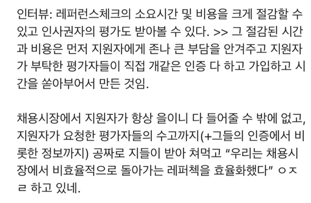 이러한 배경에서 인사권자의 평판조회는 채용시장에서 지원자를 한없이 을 혹은 병까지 만들어 내는 것이라고 생각이 든다.