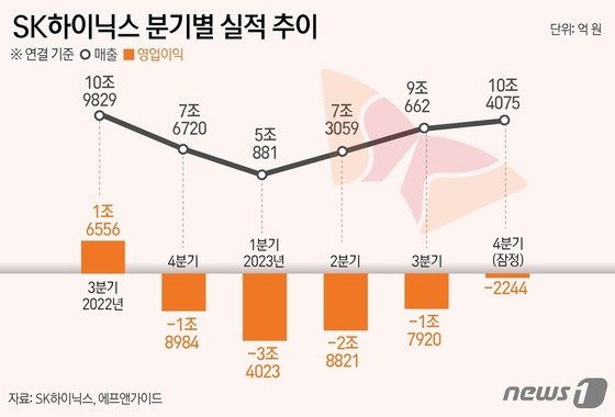 2022년 4분기 적자 전환 이후 4개 분기 연속 영업손실을 기록했던 SK하이닉스는 지난해 4분기 역시 적자를 보이겠지만 그 폭이 대폭 감소할 것이라는 전망이다.