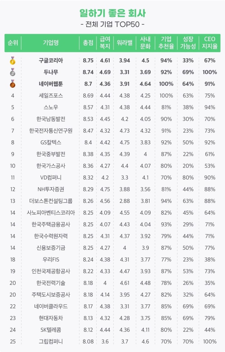주요 그룹 가운데 블라인드지수가 가장 높은 곳은 네이버(62점)였으며 이어 현대차(50점), SK(47점), 삼성(45점), 포스코·한화(각 43점) 등 순이었다. 지난해 1위였던 카카오는 올해 39점으로 LG와 함께 공동 7위로 밀렸다. 개별 기업 가운데 지난해 재직자들에게 가장 높은 평가를 받은 기업은 한국원자력안전기술원(82점)이었다. 대학내일(79점), 구글코리아·SAP코리아·시높시스코리아(각 78점), 네이버웹툰·당근(각 76점), 한국중부발전·퀄컴코리아·넥슨게임즈(각 75점)도 70점을 웃돌며 상위 10개 기업 안에 이름을 올렸다.