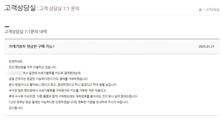 #쓰레기봉투 #종량제봉투 #쓰레기봉투카드 #쓰레기봉투카드결제 #종량제봉투카드결제 #쓰레기봉투편의점 #편의점카드결제 #편의점카드거부 #CU고객상담 #CU민원