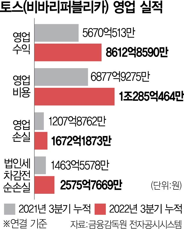 한편 토스는 국내외 투자 시장 환경 악화로 투자금 회수에 난항을 겪고 있는 상태다. 지난해 1조 원 규모의 상장 전 투자 유치(프리IPO)를 추진한 토스는 당초 계획에 못 미치는 7000억 원의 자금을 수혈했다. 이르면 올해로 예정했던 상장 일정도 2~3년 뒤로 미루기로 했다. 지난해 3분기까지 토스의 2022년 누적 영업손실은 총 1672억 원으로 전년 동기 대비 38.4% 증가했다.